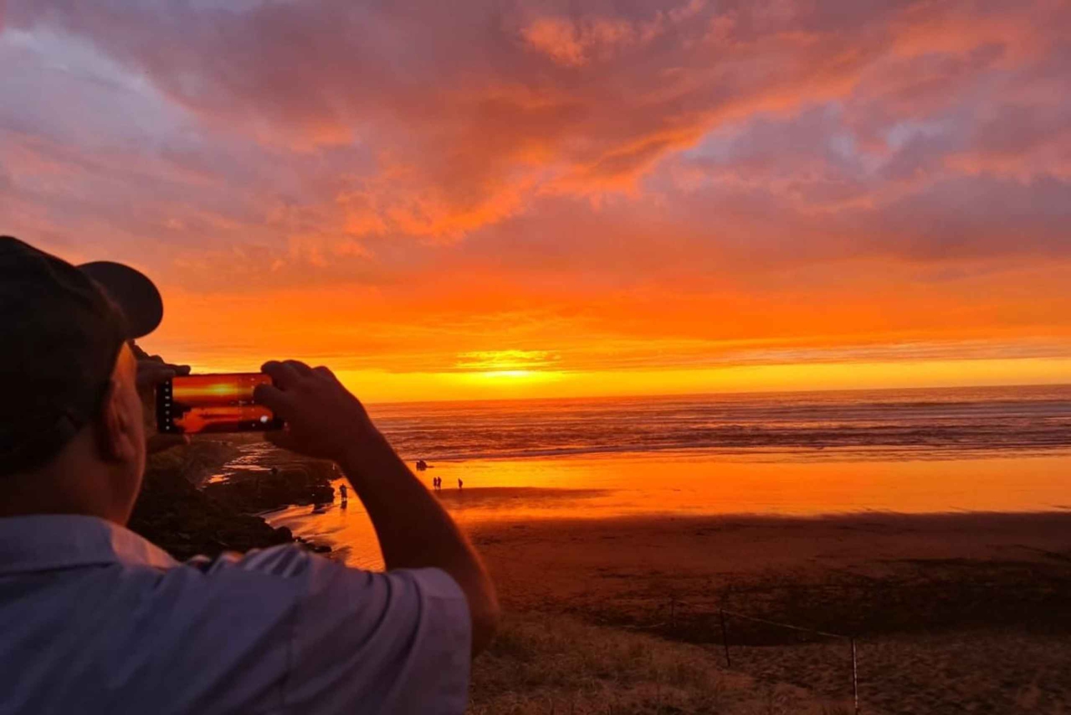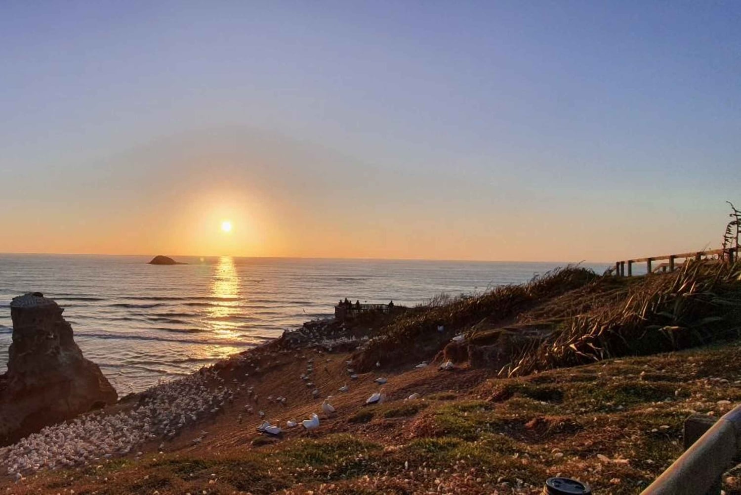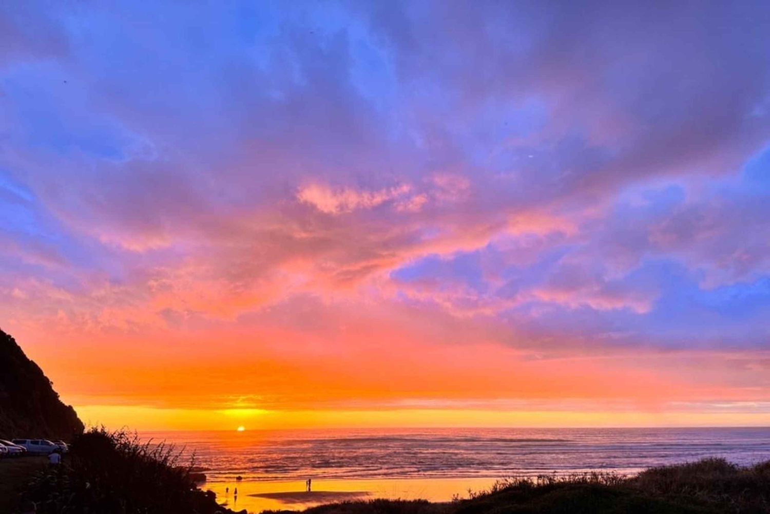Quando il sole inizia a tramontare, ti porteremo alla spiaggia di Muriwai, un punto di osservazione pittoresco per assistere al tramonto.