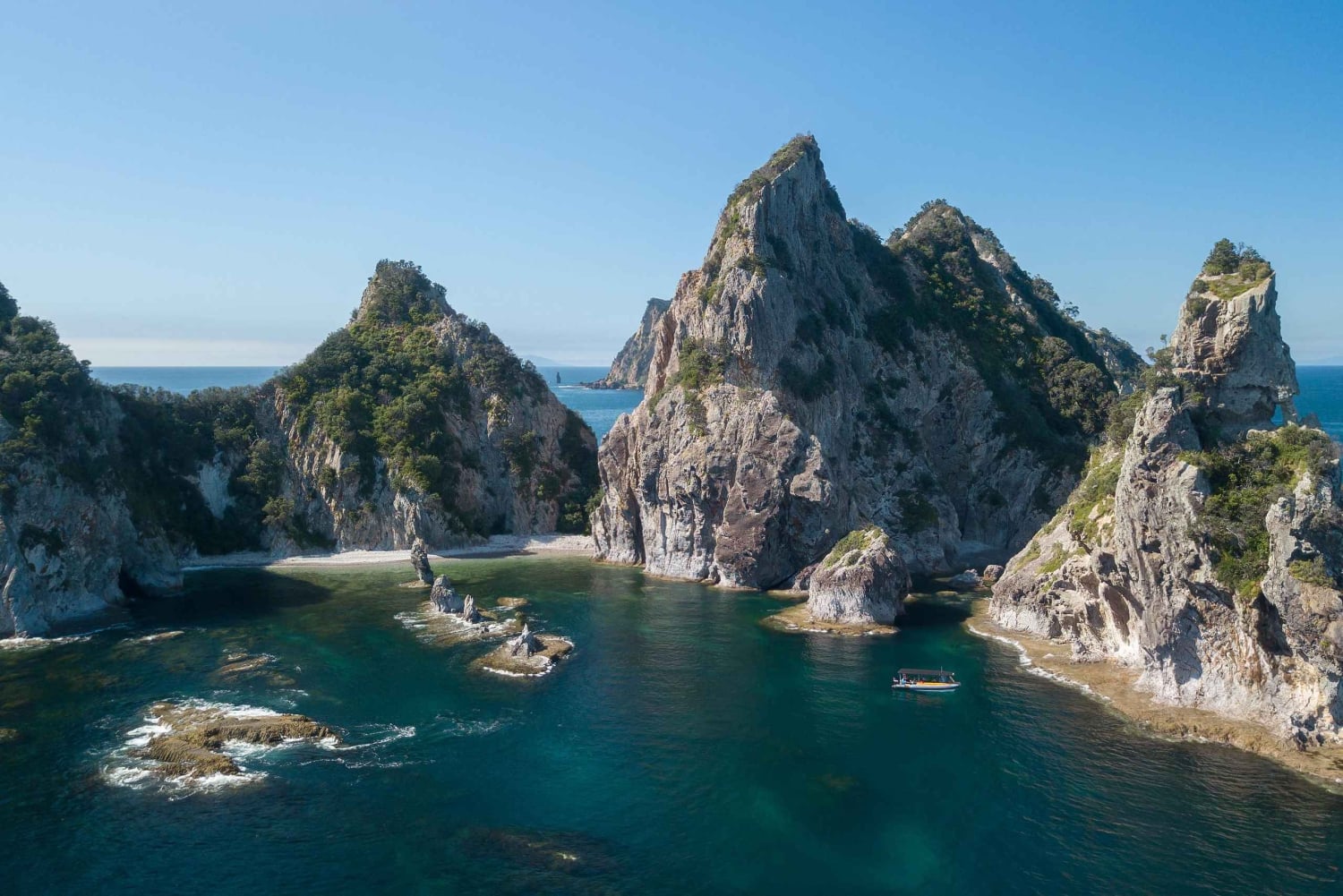 Följ med på en dagsutflykt till de fantastiska Aldermen Islands, även kända som 'de försvinnande vulkanerna'. Dessa avskilda öar har hisnande rhyolitkupoler, stupande klippor som reser sig hundratals meter och en unik flora och fauna som bara finns i detta område. Det kristallklara vattnet runt öarna är en fristad för marint liv, vilket ger möjlighet att se delfiner, valar, sköldpaddor och en mängd sjöfåglar. Blanda äventyr, naturskönhet och djurliv.